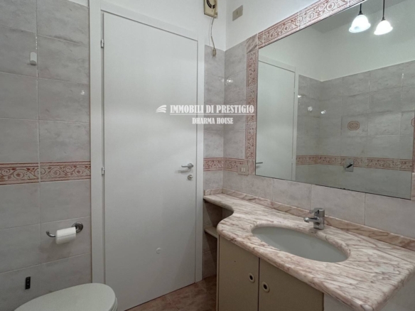 La trasformazione in trilocale è semplicissima, poiché la sala da pranzo può essere convertita in una cameretta grazie all’adiacente disimpegno che la collega al secondo bagno.